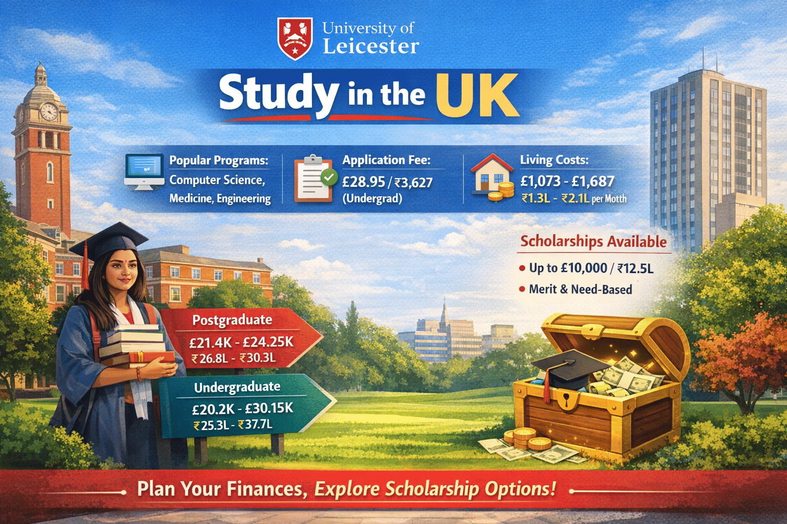 International students, before applying, should look at the fee structure of the University of Leicester and scholarship options to ease their funding and financial expenses in the UK.