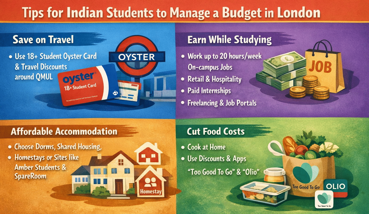 • For more affordable housing, Indian students commonly choose areas such as Mile End (near the campus), Bethnal Green or Stepney Green (accessible by short bus or Tube rides).