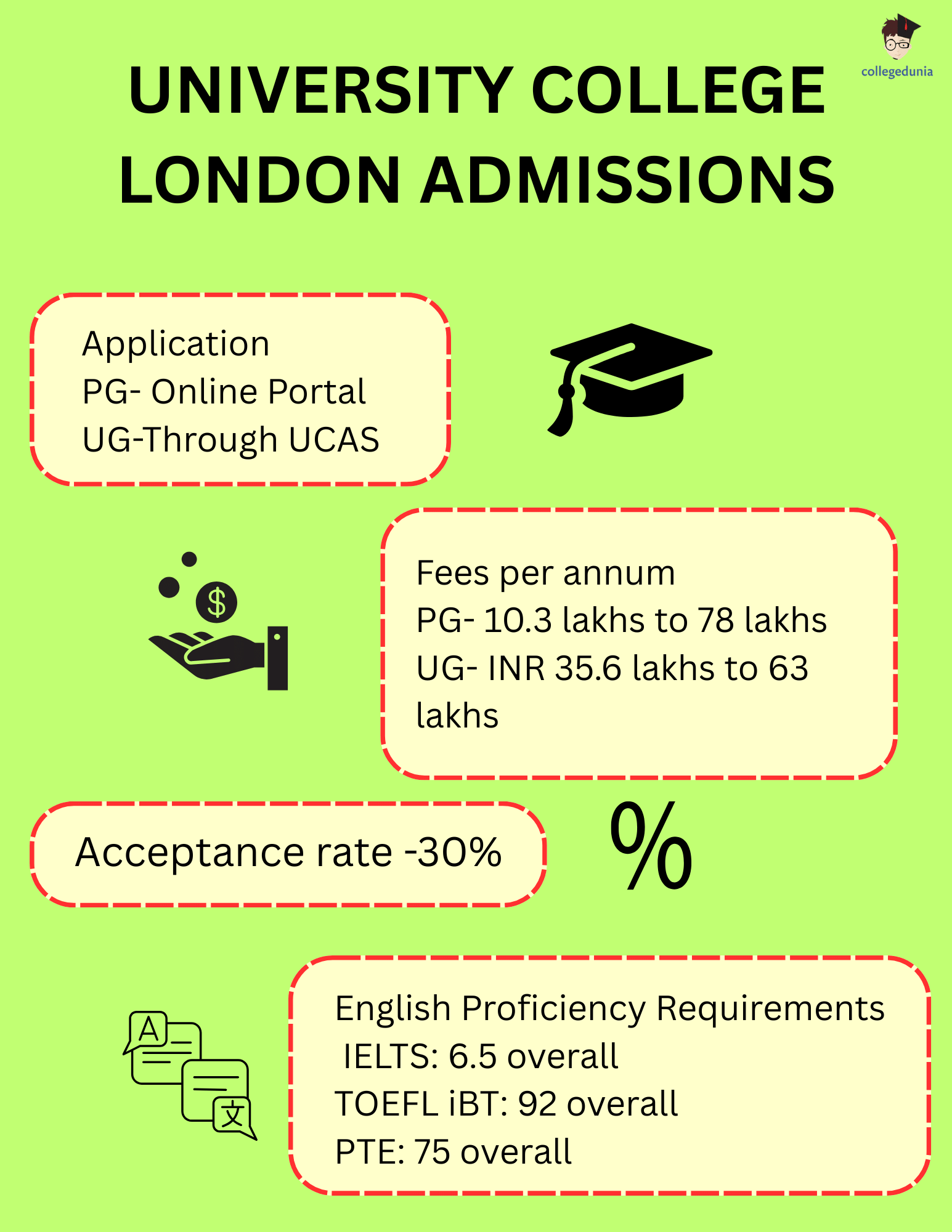The Fees for PG Courses at UCL range between GBP 8630 to GBP 65,500 (INR 10,32,531 to INR 78,36,708) per year. Similarly, Fees for UG courses are between GBP 29800 and GBP 53400 (INR 35,65,403 and 63,89,010) per year. UCL accepts admissions through UCAS. The application deadlines for PG courses vary depending on the program. The application usually starts in mid-October 2025. The application deadlines for UG programs are 14 January 2026. The deadline for our Medicine course is 15 October 2025. To get admissions into Graduate courses, International applicants must have a 3-5 year bachelor's degree with 55-70%. For Admissions in the UG courses, applicants must have 85-90% in CBSE/CISCE or a 1-year Indian bachelor's degree with 55-60%. Along with the academic requirements, Indian students must also have an English language requirement, including an IELTS score of 6.5 overall or equivalent.
