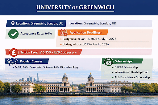 In the QS World University Rankings 2026, the University of Greenwich is ranked #801–850. To make studying more affordable for international students, the university also provides financial support through scholarships such as the GREAT Scholarship, the International Hardship Fund, and the AI and Data Science Scholarship.