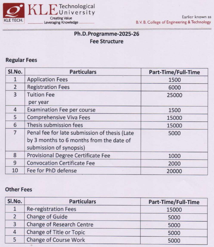 KLE Technological University Hubli Ph.D Computer Science And Engineering fees in first year is ₹ 49,500. The detailed fees is mentioned below.Check KLE Technological University Hubli Admission 2025