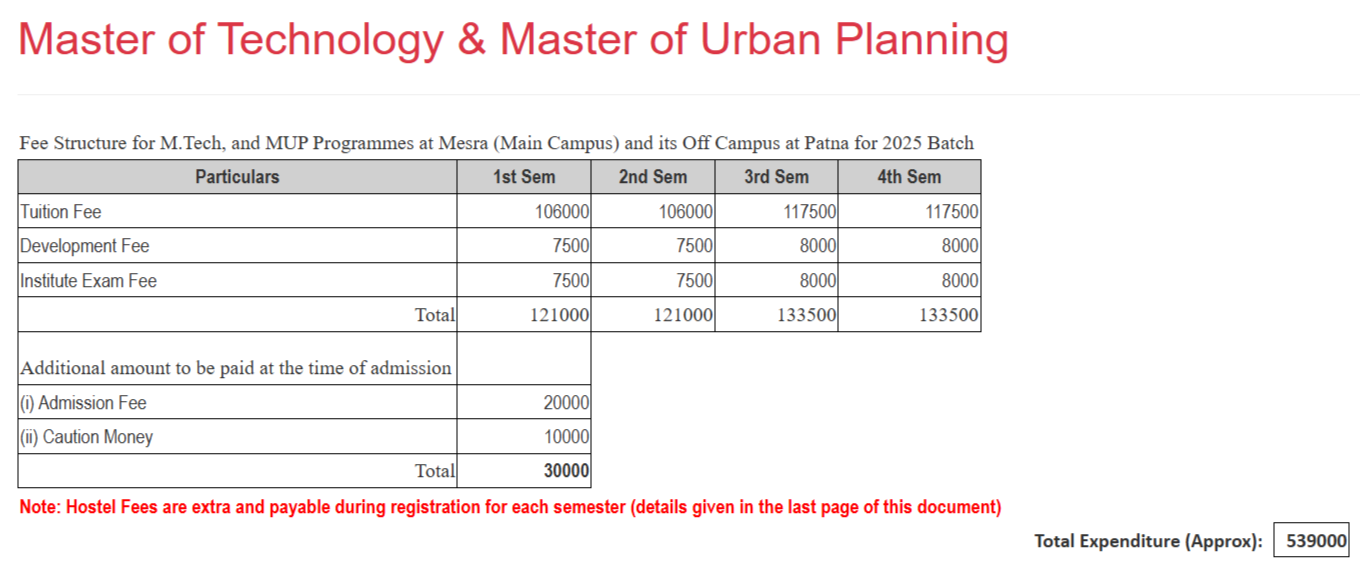 For students applying under the NRI quota for admission, the total course fee for MUP at BIT Mesra is ₹ 14.23 Lakhs.