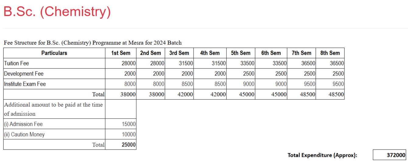 BIT Mesra B.Sc {Hons.} Chemistry fees 2025 is ₹ 3.72 Lakhs for the entire course duration.
