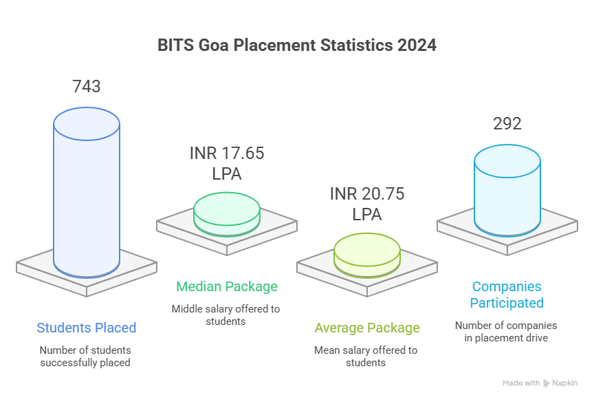 BITS Goa Placement Report 2025 has not been released yet. BITS Goa Placement 2024 concluded with 743 students getting placed. The median package offered to the student was INR 17.65 LPA, and BITS Goa average package stood at INR 20.75 LPA. A total of 292 Companies Participated in the placement drive at BITS Pilani Goa. Numerous top companies visited the campus, including Microsoft, Microsoft Research, Nestle, Adobe, Deloitte, Dell, etc.