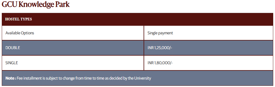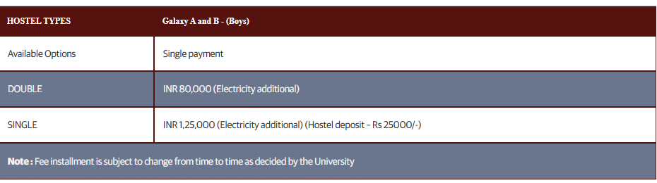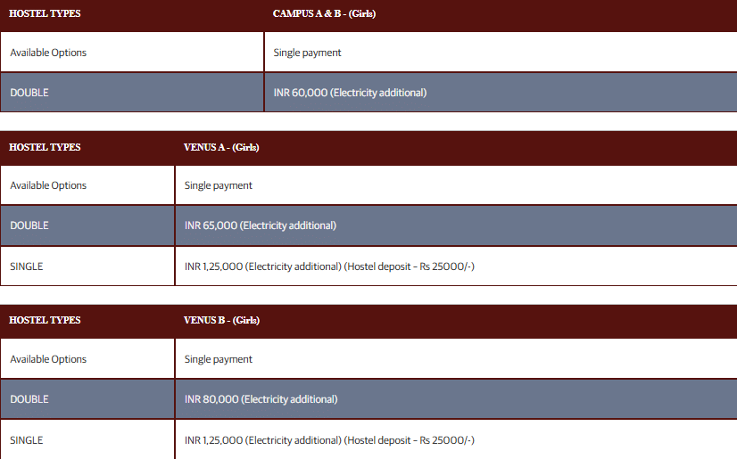The college provides multiple hostel options with eight hostels in total, including four for girls and four for boys, with options for single, double, and triple sharing rooms. Fees range from Rs. 45,000 to Rs. 1,10,000 per annum depending on the accommodation type. Facilities include attached or common bathrooms, study tables, chairs, wardrobes, electricity backup, heated water, and internet connectivity.