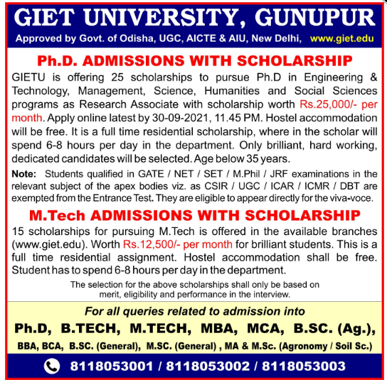 The minimum eligibility for admission to Ph.D Zoology at GIET Gunupur is Post Graduation.
