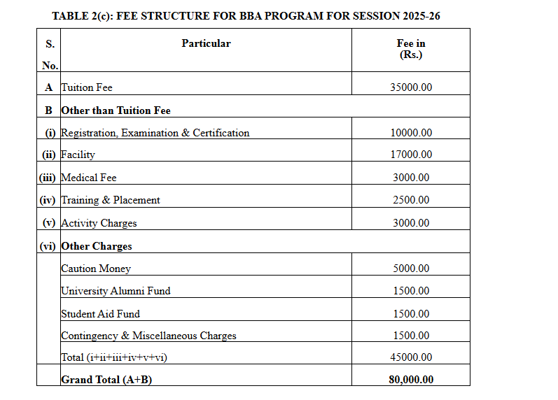 The college offers a scholarship providing 22,000 rupees annually, requiring a minimum of 75% attendance for eligibility. The BBA program's total annual fee is 80,000 rupees, alongside a one-time registration fee of 2,500 rupees upon admission, with no additional tuition or registration charges.