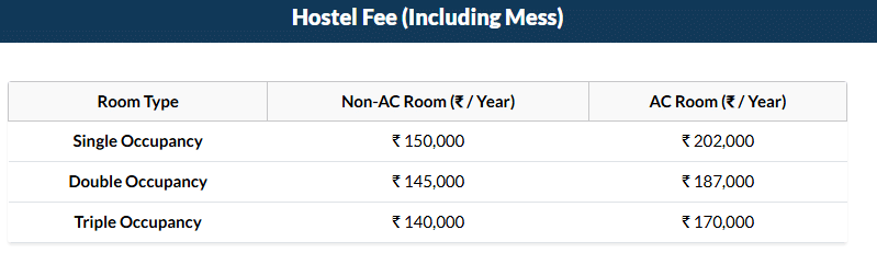The hostel offers a well-maintained infrastructure and various facilities, including daily cleaning, 24/7 electricity, and Wi-Fi access. Rooms are available in single, double, and triple occupancy, with both AC and non-AC options. The hostel fee ranges from approximately Rs. 80,000 to Rs. 1,30,000 per year, depending on the room type.