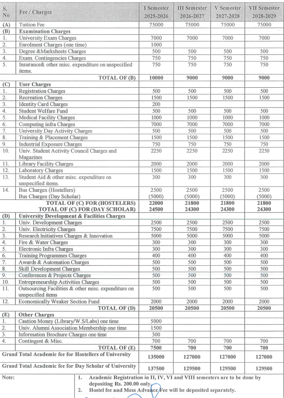 The average CTC is around Rs. 7 LPA, with the highest reaching Rs. 52 LPA, and over 50 companies participating in recruitment. Internships from the fourth semester are crucial, and a CGPA above 7.5 is recommended for optimal placements. Overall placement rates are 80-90%. The fee for day scholars is Rs. 1,08,000 annually, and hostelers pay Rs. 1,35,000 plus a Rs. 15,000 mess fee. B. Pharm students pay an annual fee of Rs. 1,37,500, with hostel fees ranging from Rs. 24,000 to Rs. 29,000 per semester and a mess fee of Rs. 18,000 per semester.