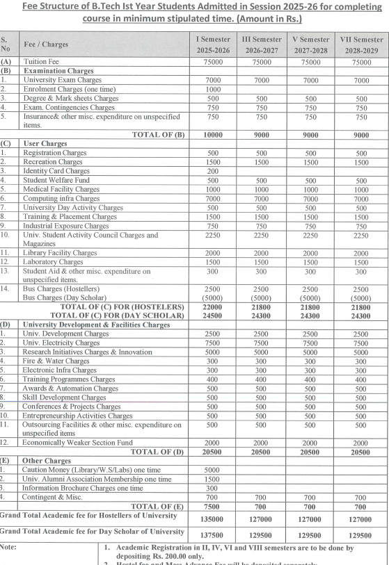 The total cost for completing a B.Tech degree is under 5 lakh INR. Scholarships are available, including state government financial aid for students with annual parental incomes below 2 lakh INR, providing 60,000 to 80,000 INR annually. A Tuition Fee Waiver Scheme (TFWS) is available for families earning below 6 lakh INR, and there are additional scholarships from alumni and NGOs. The UP government offers around 50,000 INR for General and OBC students and 90,000 INR for SC/ST students.