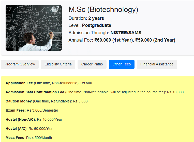 Earlier, M.Sc Biotechnology fees at NIST University was ₹ 1.41 Lakhs (in 2025) for the entire course duration. This shows a fee increase of ₹ 3.13 Lakhs over the year.