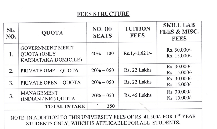Admission fees differ based on quotas; the private quota fee is Rs. 22,00,000 including all charges, while the government quota fee is Rs. 1,00,000. Scholarships for hostel facilities are available, alongside additional scholarships for merit-based students. The institution offers a rich learning environment with access to a hospital with a high patient influx, and students can engage in fests and workshops. The campus is secure, featuring transport facilities with reliable drivers and surveillance cameras.