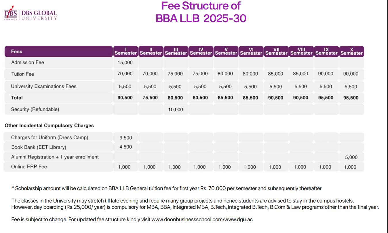 DBS Global University Dehradun BBA + LLB fees 2025 is ₹ 9.09 Lakhs for the entire course duration.