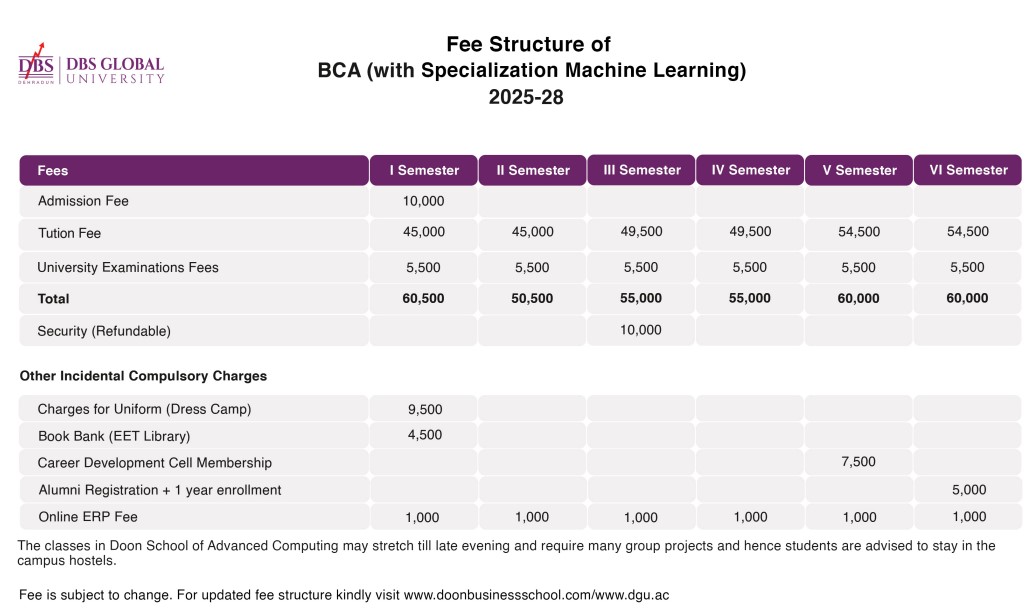 DBS Global University Dehradun BCA Machine Learning fees 2025 is ₹ 3.84 Lakhs for the entire course duration.