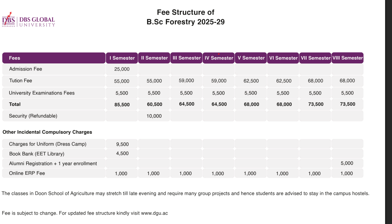 Find detailed DBS Global University Dehradun B.Sc Forestry fees, eligibility, admission dates, cutoff and ranking below.