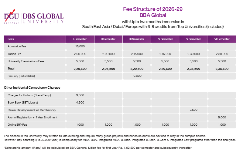 Earlier, BBA Global Business fees at DBS Global University Dehradun was ₹ 7.16 Lakhs (in 2025) for the entire course duration. This shows a fee increase of ₹ 7.15 Lakhs over the year.