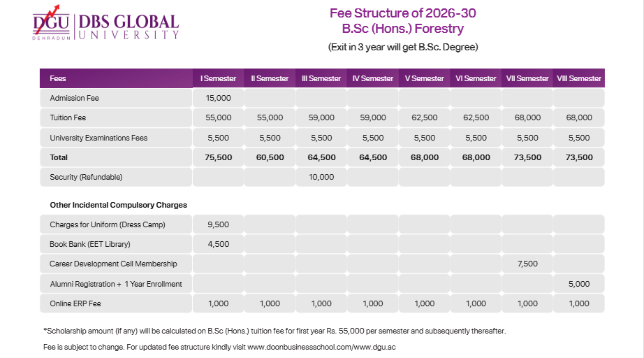 DBS Global University Dehradun B.Sc {Hons.} Forestry fees 2026 is ₹ 5.93 Lakhs for the entire course duration.