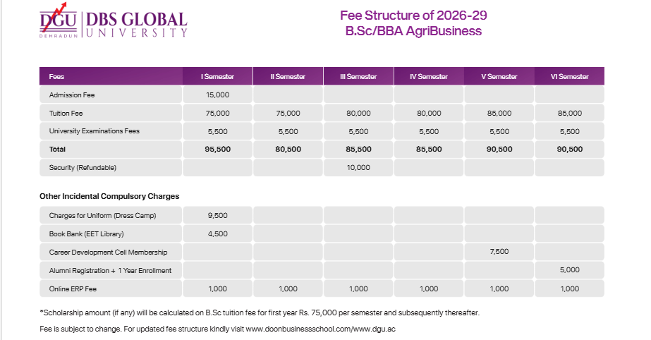 23 Jan, 2026 DBS Global University Dehradun BBA Agri-Business Management Fee Structure 2026 has been released. The total academic fee is ₹ 5.71 Lakhs. Read more.