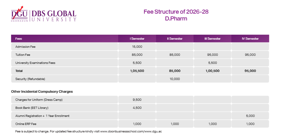 DBS Global University Dehradun D.Pharm Pharmacy fees 2025 is ₹ 1.96 Lakhs for the entire course duration.