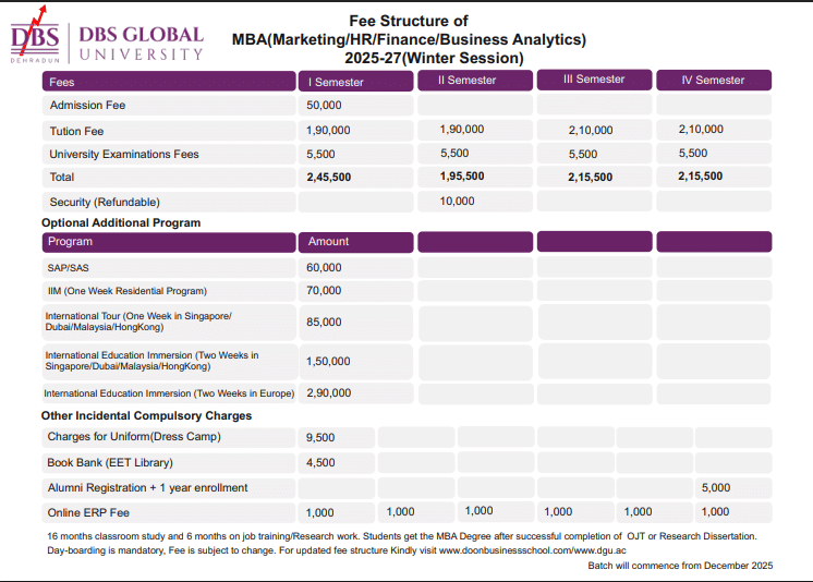 Earlier, MBA Business Analytics fees at DBS Global University Dehradun was ₹ 7.52 Lakhs (in 2024) for the entire course duration. This shows a fee increase of ₹ 2.13 Lakhs over the year.