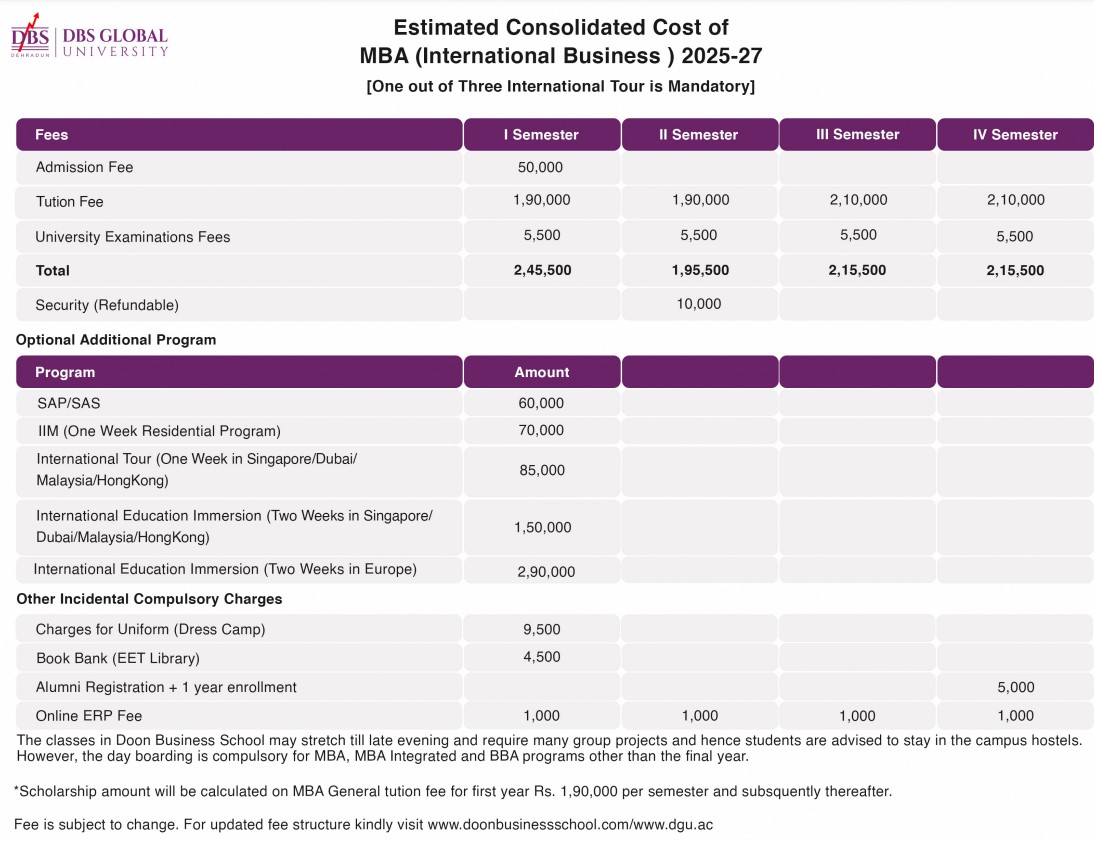 In 2017, the PGDM fee was 4,80,000 INR, and hostel charges could reach 2,80,000 INR, though cheaper off-campus options exist. The MBA in International Business at DBS Global University costs 7,80,000 INR for two years, plus additional fees between 1 to 1.3 lakh INR. Annual hostel costs are about 2,00,000 INR. Scholarships are available for Uttarakhand domicile students and those excelling in exams like CAT and CMAT.