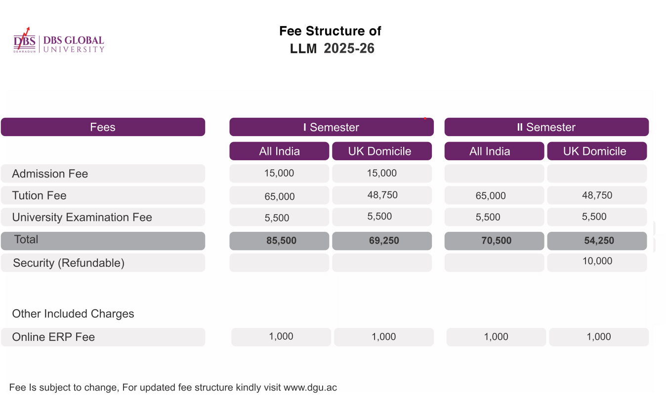 DBS Global University Dehradun L.L.M fees 2025 is ₹ 1.58 Lakhs for the entire course duration.