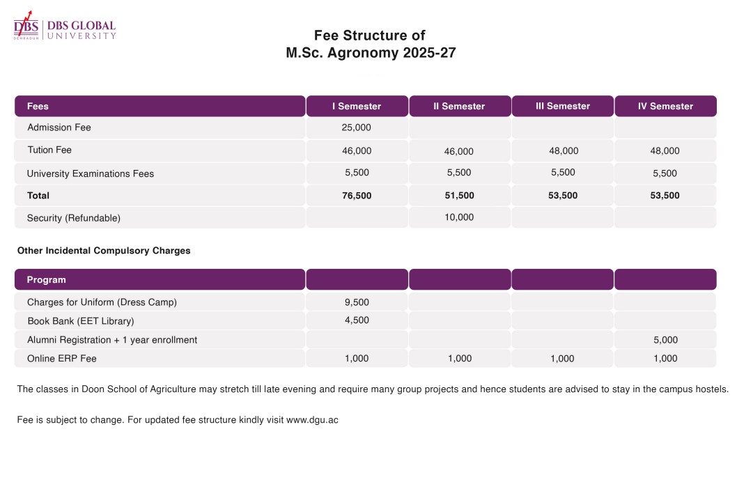 DBS Global University Dehradun M.Sc Agronomy fees 2025 is ₹ 2.68 Lakhs for the entire course duration.