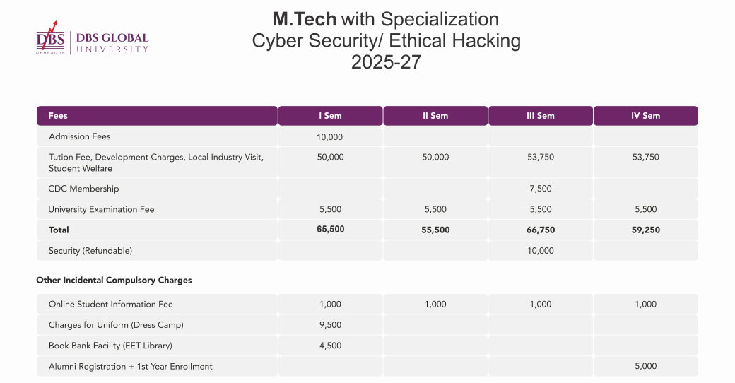 Earlier, M.Tech Ethical Hacking fees at DBS Global University Dehradun was ₹ 2.62 Lakhs (in 2024) for the entire course duration. This shows a fee increase of ₹ 18,000 over the year.