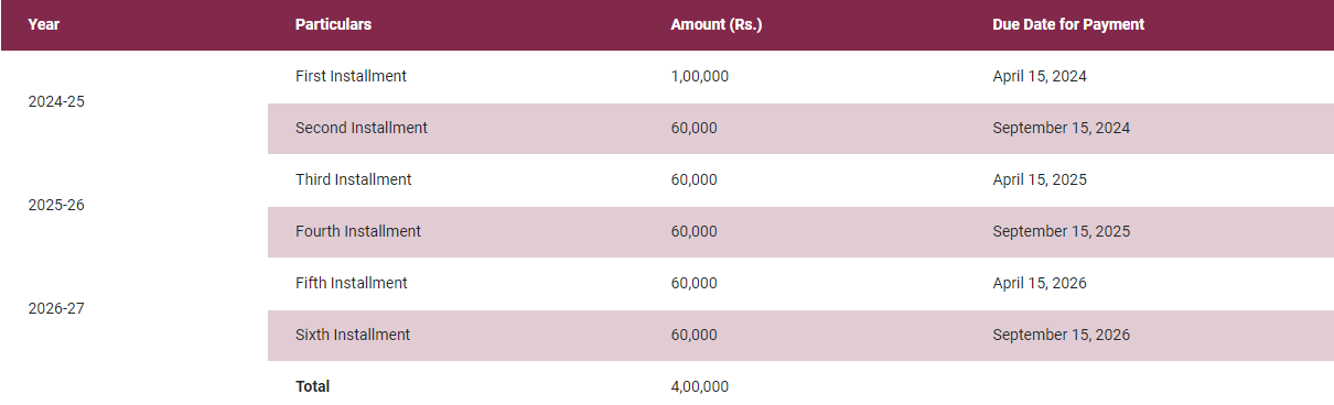 | Semester Wise Fees | ₹100000 | ₹60000 | ₹60000 | ₹60000 | ₹60000 | ₹60000 |