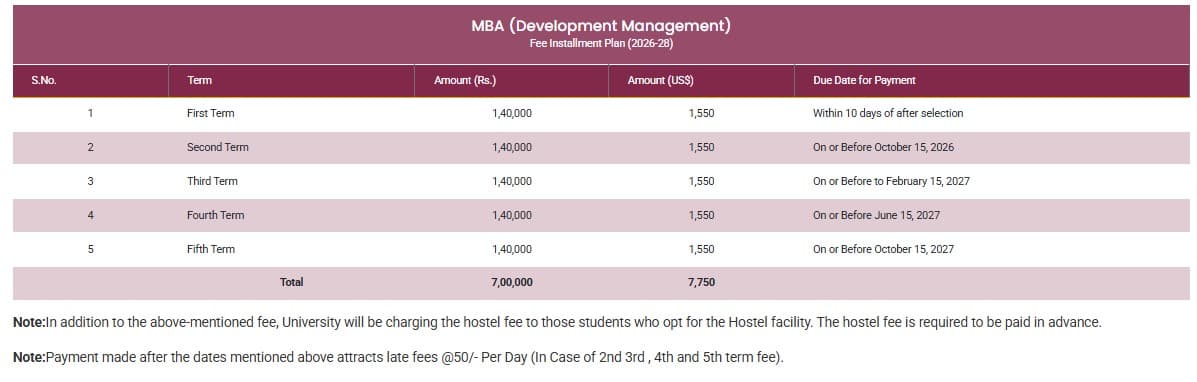 Earlier, MBA Development Management fees at IIHMR Jaipur was ₹ 8.71 Lakhs (in 2025) for the entire course duration. This shows a fee increase of ₹ 9,000 over the year.