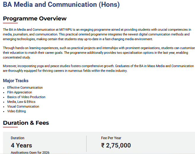 BA {Hons.} Media Communication Fees at MITWPU covers a range of expenses, including tuition fee, course materials, and access to campus facilities.