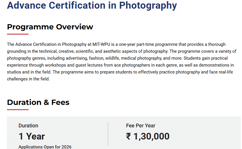 Certification Advanced Photography Fees at MITWPU covers a range of expenses, including tuition fee, course materials, and access to campus facilities.