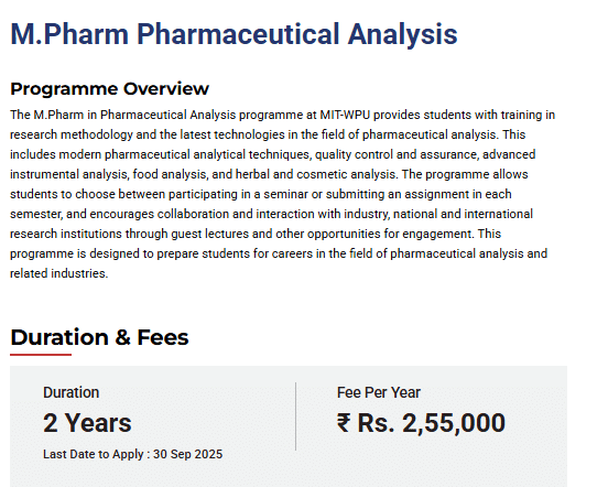 Earlier, M.Pharm Pharmaceutical Analysis fees at MITWPU was ₹ 5.1 Lakhs (in 2025) for the entire course duration. This shows that the fee has remained unchanged since 2025.