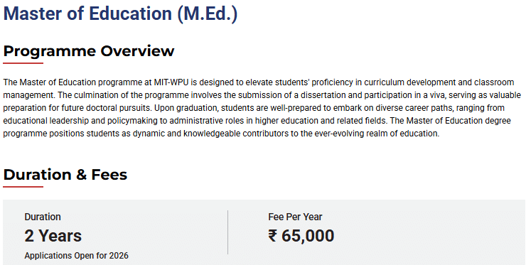 Earlier, M.Ed fees at MITWPU was ₹ 1.3 Lakhs (in 2025) for the entire course duration. This shows that the fee has remained unchanged since 2025.