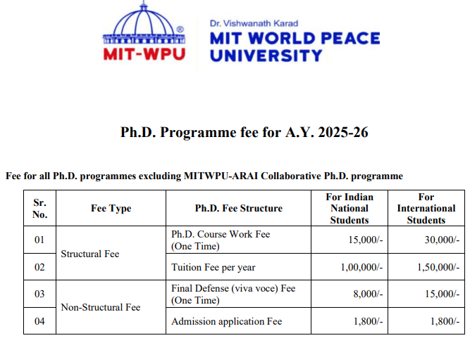 Earlier, Ph.D Environmental Science fees at MITWPU was ₹ 3.23 Lakhs (in 2024) for the entire course duration. This shows that the fee has remained unchanged since 2024.