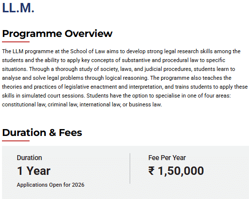 Earlier, L.L.M fees at MIT-WPU was ₹ 1.5 Lakhs (in 2025) for the entire course duration. This shows that the fee has remained unchanged since 2025.