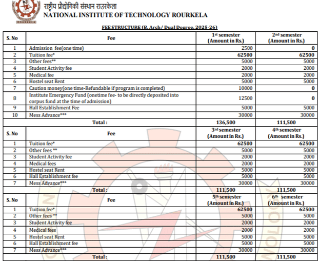 Earlier, B.Arch fees at NIT Rourkela was ₹ 10.21 Lakhs (in 2023) for the entire course duration. This shows a fee decrease of ₹ 2.28 Lakhs over the year.