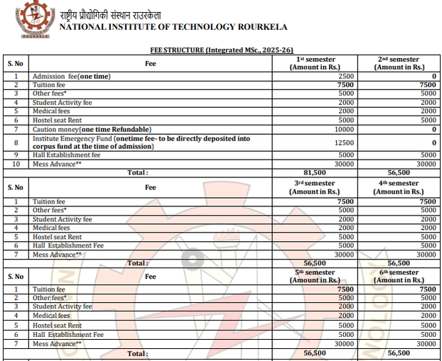 Earlier, B.Sc + M.Sc Physics fees at NIT Rourkela was ₹ 4.68 Lakhs (in 2023) for the entire course duration. This shows a fee decrease of ₹ 2.25 Lakhs over the year.