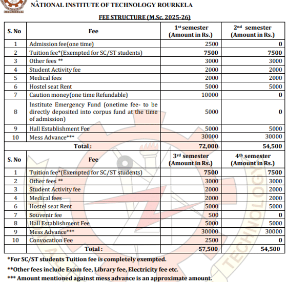Earlier, M.Sc Physics fees at NIT Rourkela was ₹ 98,500 (in 2022) for the entire course duration. This shows that the fee has remained unchanged since 2022.