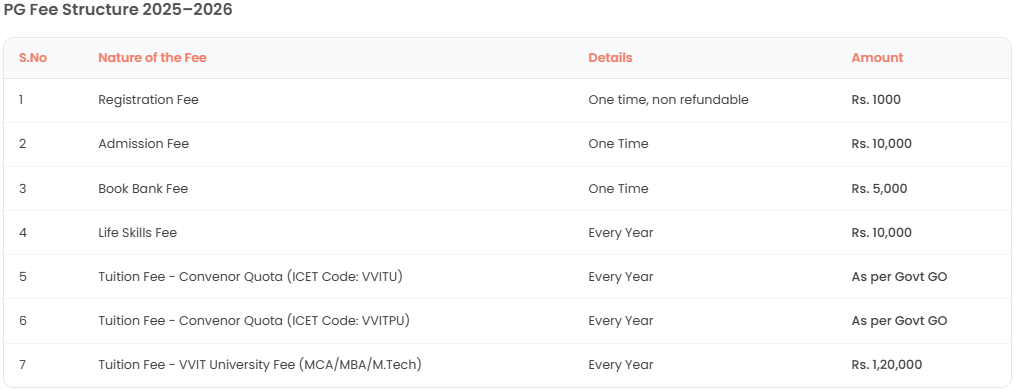 VVITUGuntur M.Tech Structural Engineering fees in first year is ₹ 80,000. The detailed fees is mentioned below.VVITUGuntur Hostel Fee is ₹ 75,000 to 1 Lakh.
