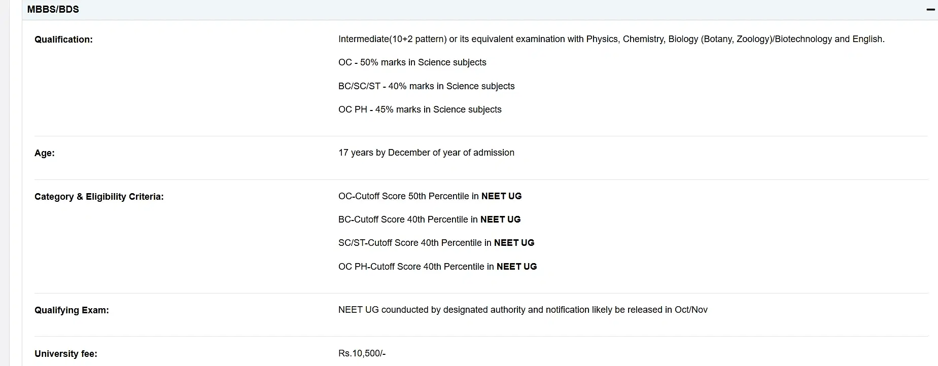 Students must pass two of three internal exams to qualify for final exams, with a strict attendance policy of 75% in theory and 80% in practicals. The program costs around 60 lakhs over five years, with an annual fee of about 12 lakhs and a university fee of Rs. 10,500. While this is considered expensive compared to private colleges, education loans and scholarships, such as the Jaganna Vidya Deevana providing around Rs. 80,000 annually, are available.