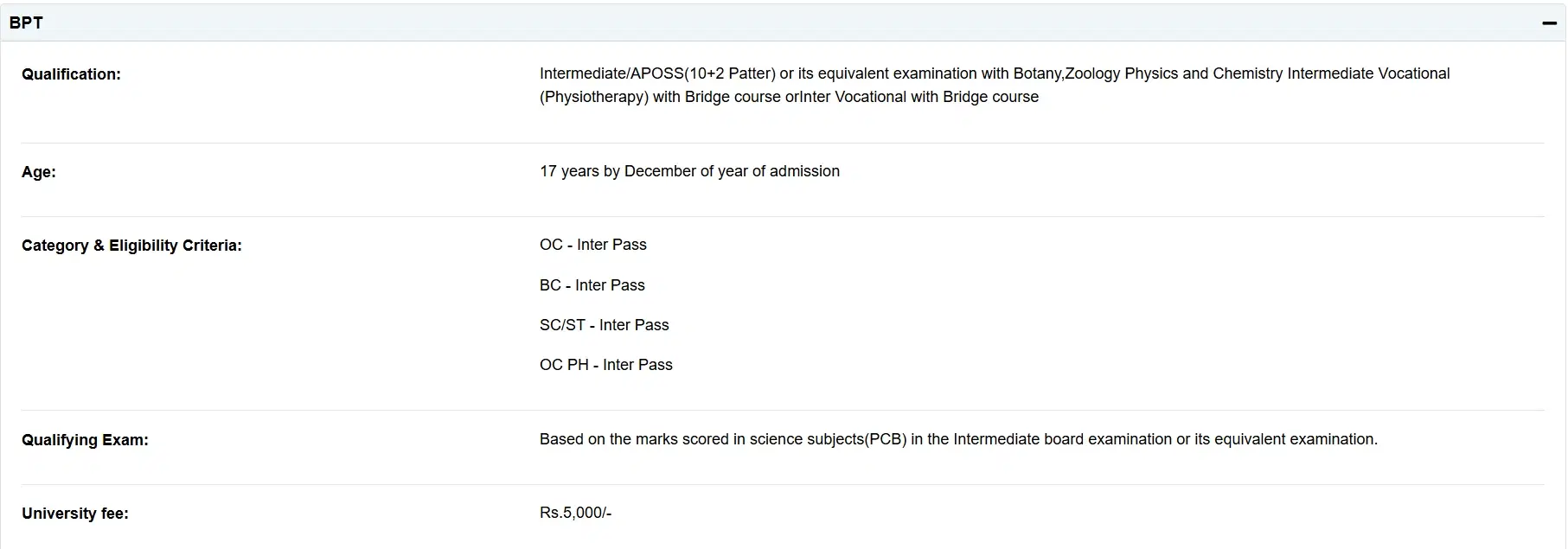 Find detailed NTRUHS B.P.T fees, eligibility, admission dates, cutoff and ranking below.