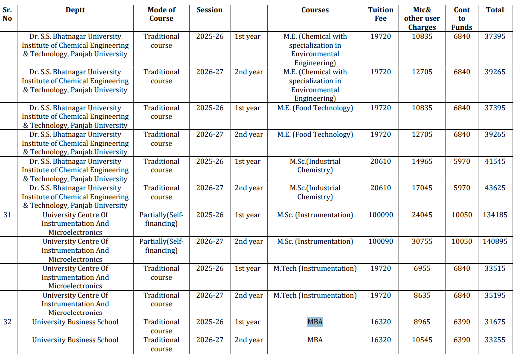 At Panjab University, MBA students with over 80% aggregate can receive a 25% fee concession. The MBA fee across four semesters totals INR 1,00,000, with varying fees for different specializations: INR 6,000 per semester for core MBA, International Business, and Human Resources, and INR 45,000 per semester for MBA entrepreneurship.