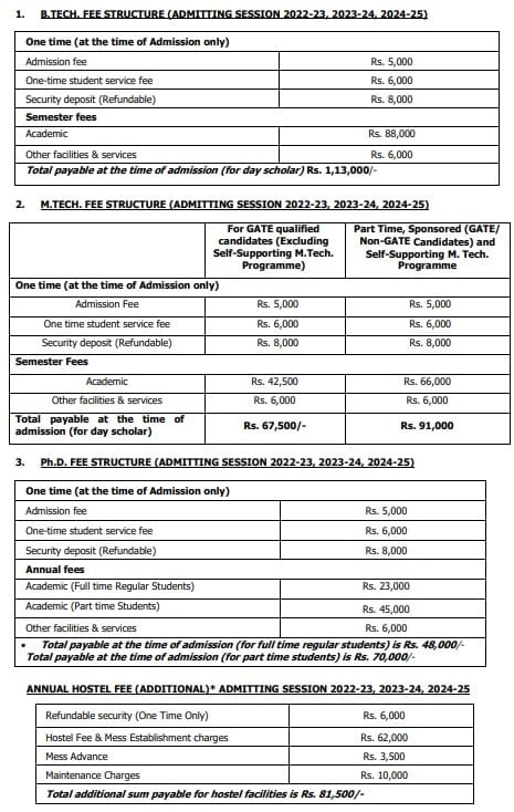 Scholarships are available, focusing on merit and need-based aid. SC/ST students receive full tuition waivers, and there are several scholarships for women based on JEE Mains ranks. The B.Tech semester fee is about 88,000 INR, and the M.Tech fee for GATE-qualified candidates is 42,500 INR per semester. Fees are subject to a 10% annual increase.