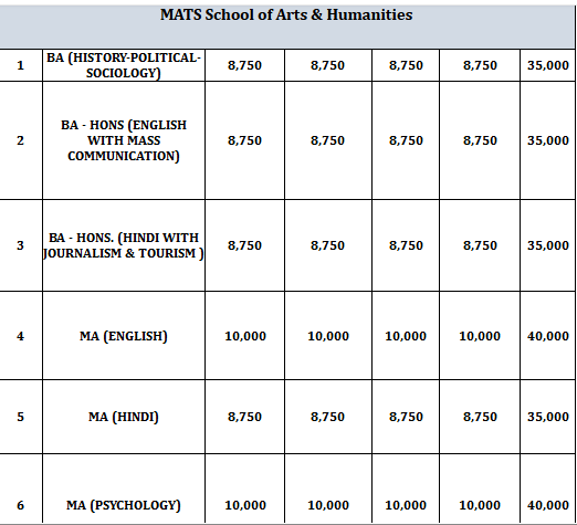 BA {Hons.} English with Mass Communication at MATS University Raipur is a 3 Years Degree. The course is offered On Campus as a Full Time program. MATS University Raipur BA {Hons.} English with Mass Communication First Year Fees is INR 35,000 for 2025.
