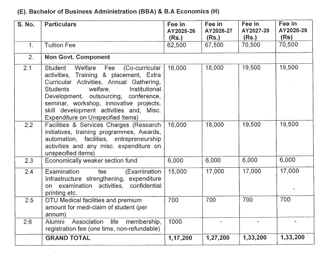 Prestigious companies like Google, Microsoft, and TCS are among the key recruiters. Internships are compulsory in the second year, with placement eligibility starting from the third year. Internship fairs feature around 50 companies, offering approximately 1,200 opportunities, with stipends ranging from unpaid to 20,000 INR per month. The BBA program at Delhi Technology University (DTU) costs between INR 3,00,000 and INR 5,60,000 over three years, with annual tuition fees from INR 90,000 to INR 1,80,000.