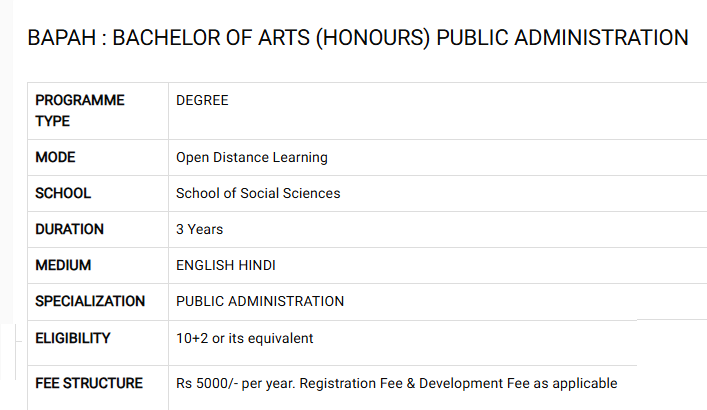 IGNOU BA {Hons.} Public Administration is offered as 3 Years Part Time program. The minimum eligibility criteria for BA {Hons.} is Pass 10+2. The total fees for IGNOU BA {Hons.} Public Administration in 2025 is ₹ 15,000 for the complete course duration, which includes total tuition fees of ₹ 15,000. Earlier, the fees in 2024 - 2025 for BA {Hons.} Public Administration was ₹ 15,000.