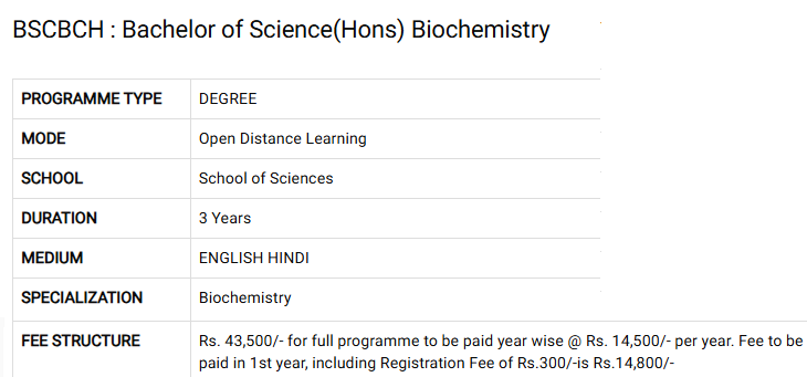 The B.Sc. Biochemistry (Hons.) costs 16,000 INR annually, summing to 48,000 INR. Additional costs include 200 INR per practical and optional study materials, with a 2,000 INR fee reduction if declined. No scholarships or campus employment options are available, and the fee structure is higher compared to other distance learning courses. However, the university provides home-delivered study materials for convenience.