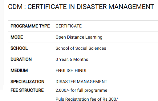 IGNOU Certification Disaster Management fees 2025 is ₹ 2,900 for the entire course duration.