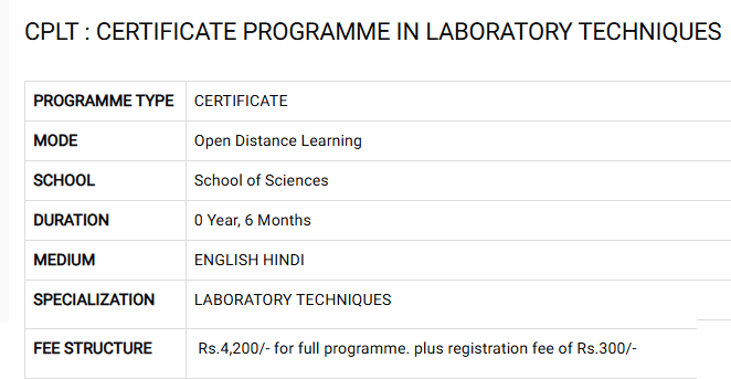 IGNOU Certification Laboratory Techniques fees 2025 is ₹ 4,500 for the entire course duration.